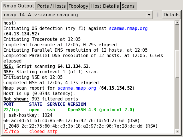 Nmap's output is displayed during and after a scan. This output will be familiar to Nmap users. Except for Zenmap's color highlighting, this doesn't offer any visualization advantages over running Nmap in a terminal. However, other parts of Zenmap's interface interpret and aggregate the terminal output in a way that makes scan results easier to understand and use.