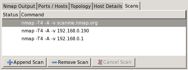Each scan window contains five tabs which each display different aspects of the scan results. They are: “Nmap Output”, “Ports / Hosts”, “Topology”, “Host Details”, and “Scans”. Each of these are discussed in this section.