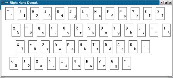 I picked a line that read, “ o. x,9a [ F | 8 xi@x.7xdqz -x7o Goe9-” -- It looked like an average-sized command. I typed on my keyboard, which had the letters in the standard QWERTY locations. As I did so, my new X11 keyboard mapping, set via the setxkbmap command, translated them to the right-handed Dvorak keyboard layout. On my screen appeared an intelligible UNIX command: